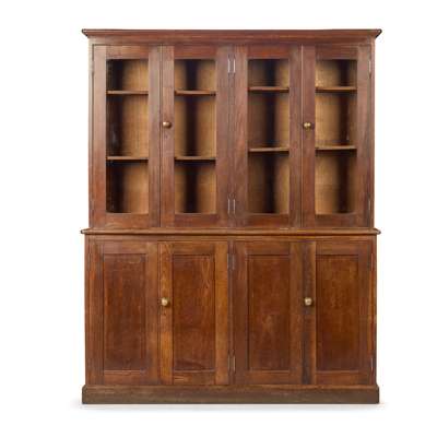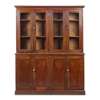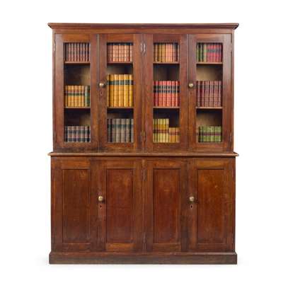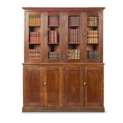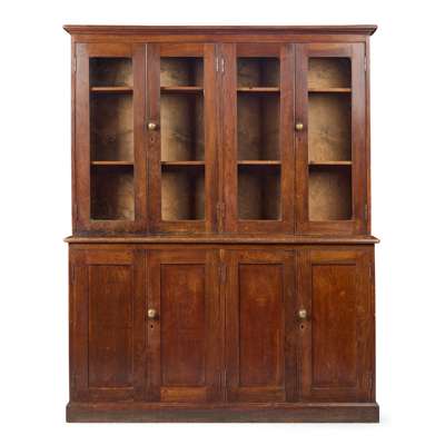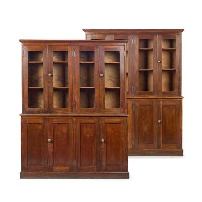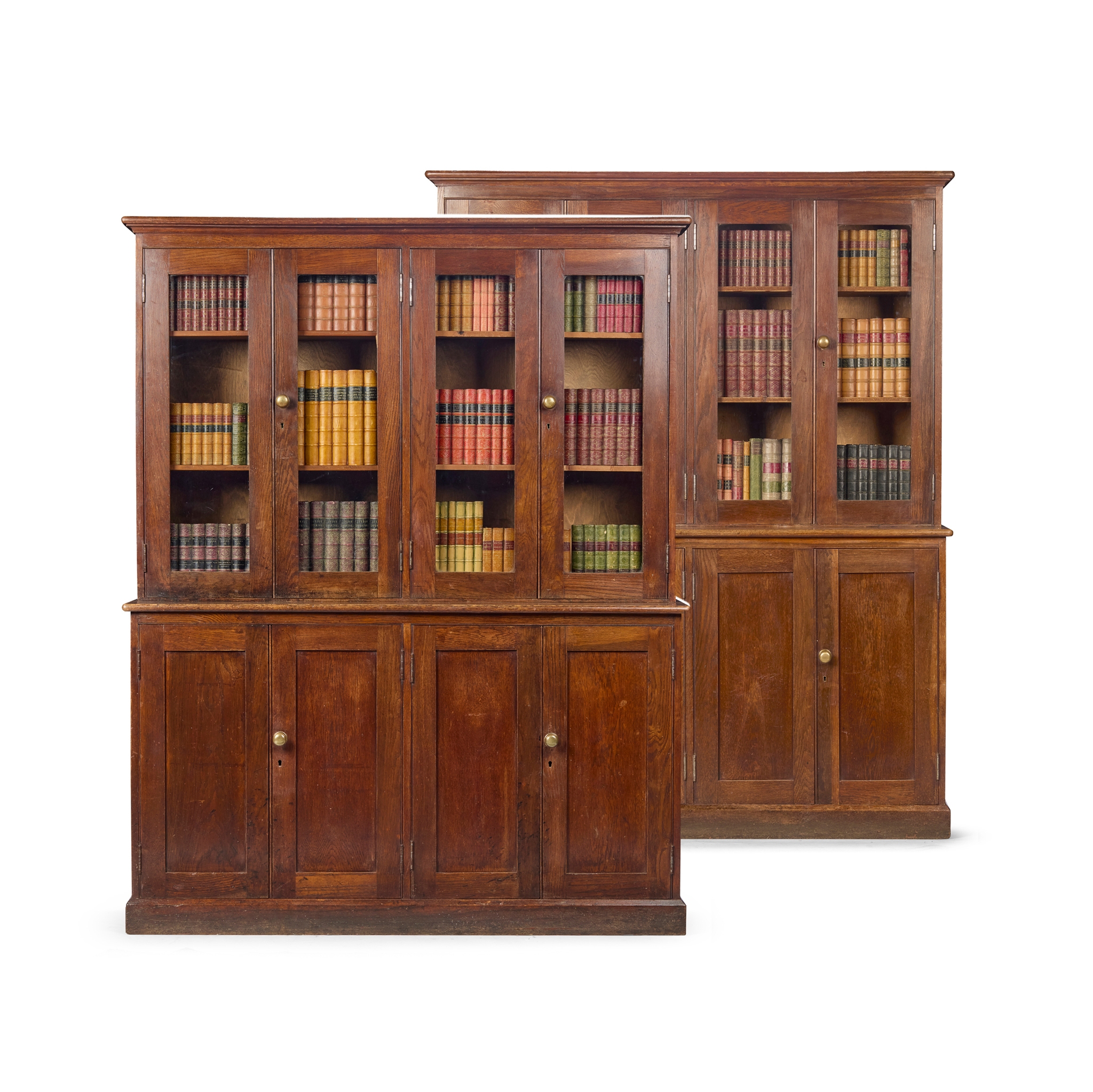 each with a moulded cornice above two pairs of glazed doors enclosing adjustable shelves; the lower part with two further panel doors, on a plinth base (2)