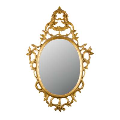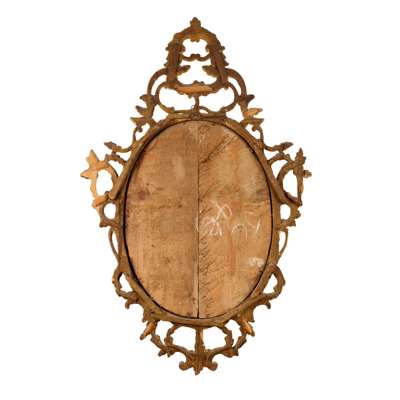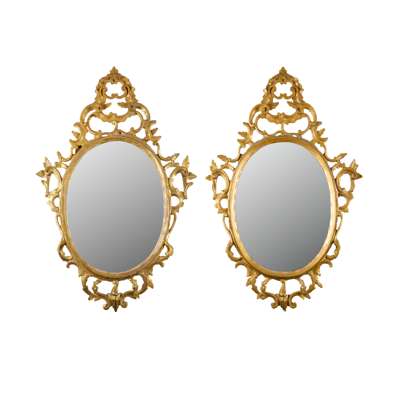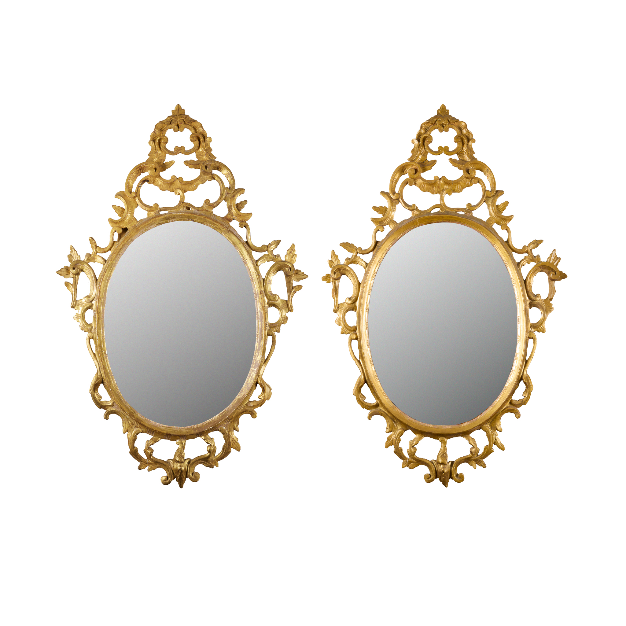 the oval mirror plates in carved pierced frames with rocaille, c-scrolls, and foliate details (2)
