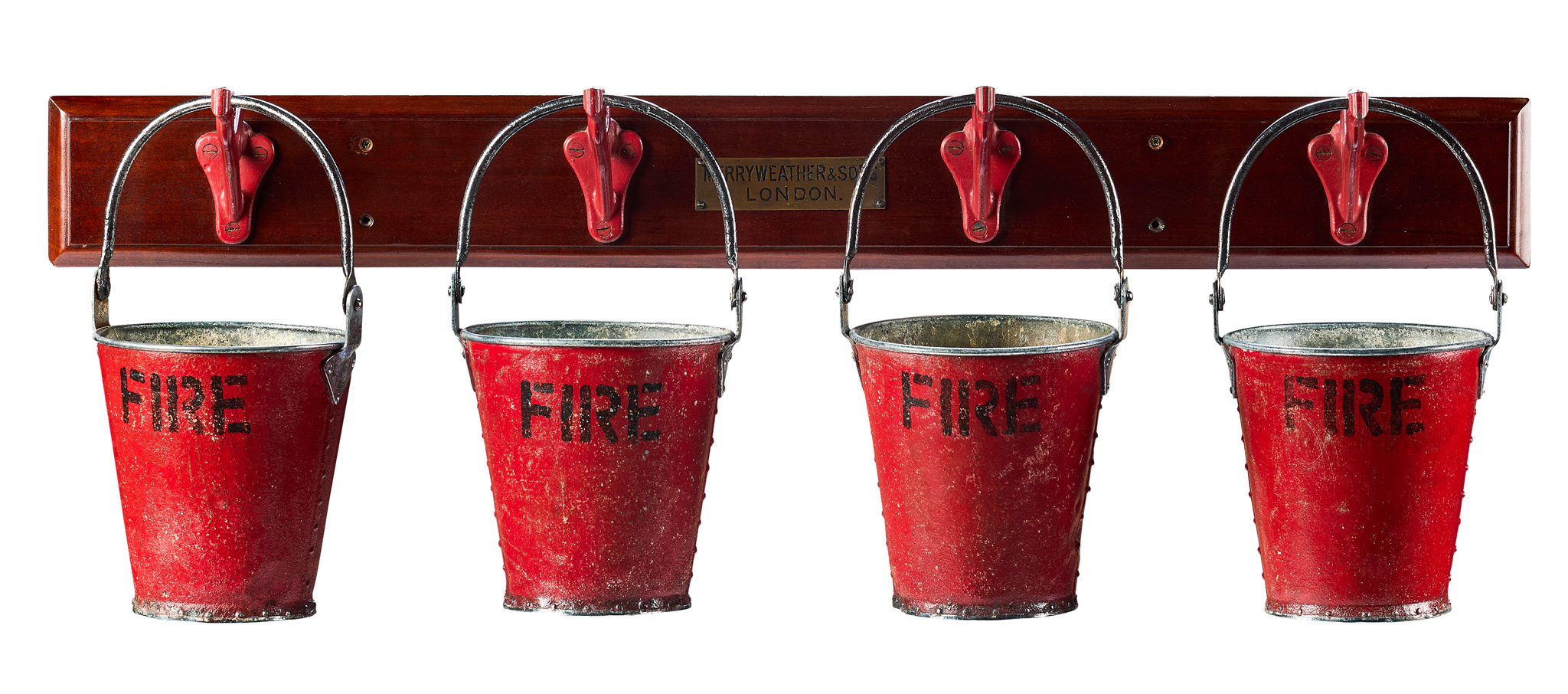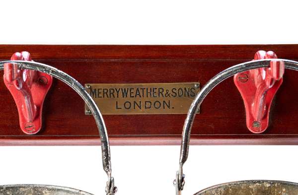 the back board mounted with four large red-painted cast iron coat hooks, with an engraved brass plaque MERRYWEATHER & SONS LONDON, together with four red painted steel sand buckets stencilled FIRE, and another bucket larger with a rounded bottom similarly decorated