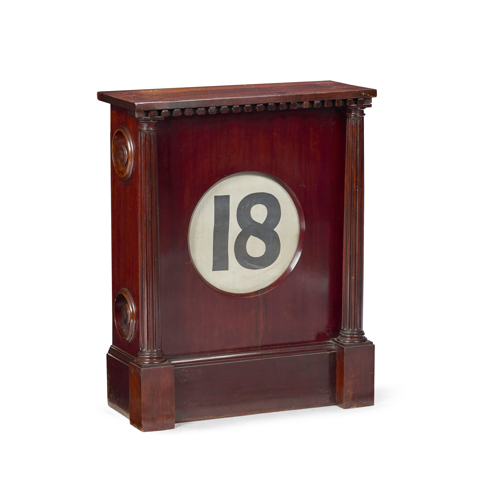 the dentil moulded cornice above a circular date aperture, flanked by fluted Doric columns, with adjustment knobs to the sides, on a plinth base