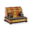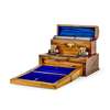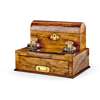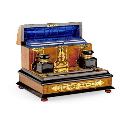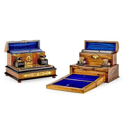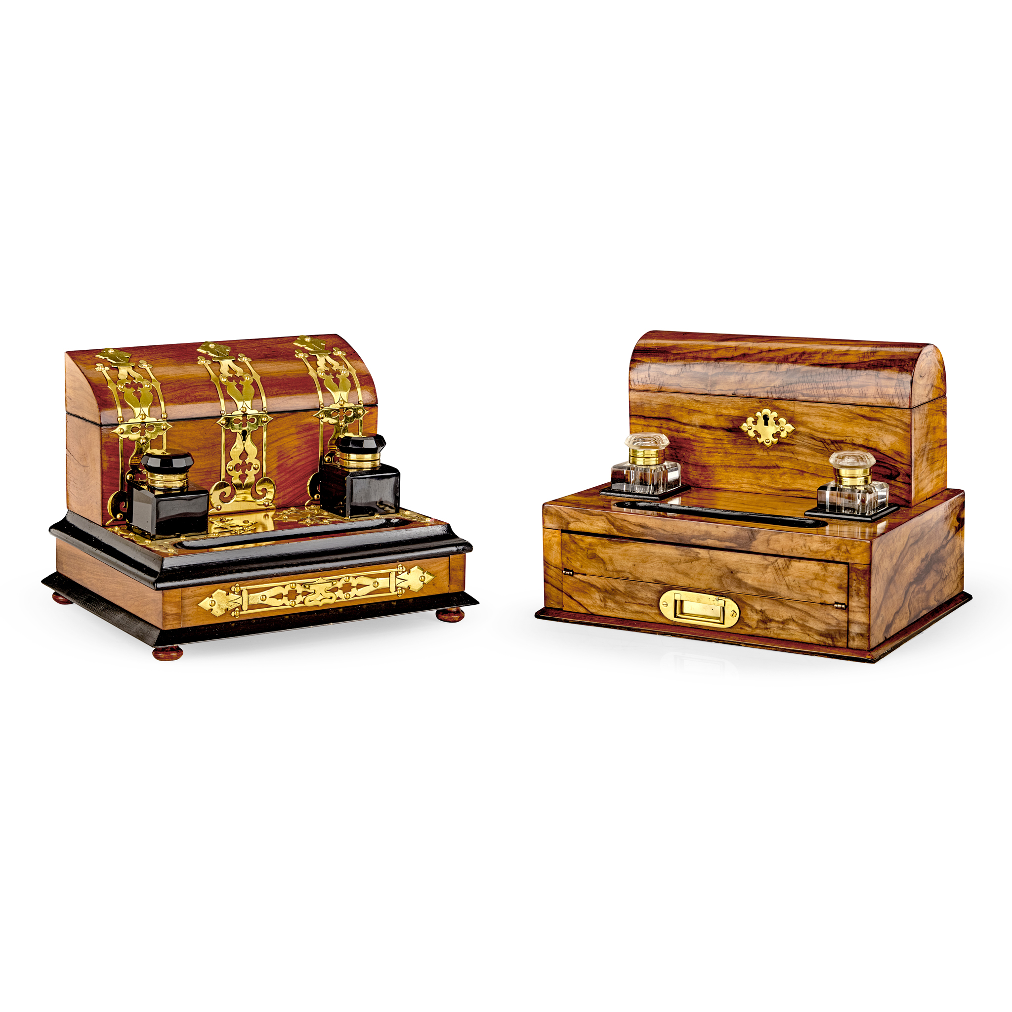 one with an arched stationery box, above a pair of glass inkwells, pen tray, and a spring-release folding writing surface; the other with pierced gothic style brass strapwork, a stationery box, a pair of cobalt glass inkwells, pen tray, and a base drawer (2)