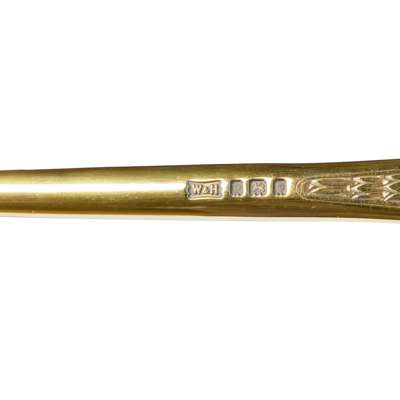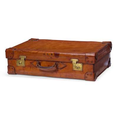in tan leather with reinforced corners and brass hardware, the interior fitted with silver gilt accessories monogrammed ALW with engine turned covers, including jars, brushes, shoehorn, comb, mirror and document folder, marks for Walker and Hall, London 1928-1930
