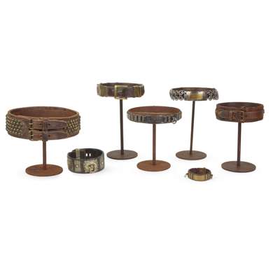 COLLECTION OF LEATHER DOG COLLARS AND STANDS
