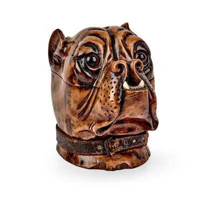 VICTORIAN CARVED LIGNUM VITAE BULLDOG'S HEAD TOBACCO JAR Y
