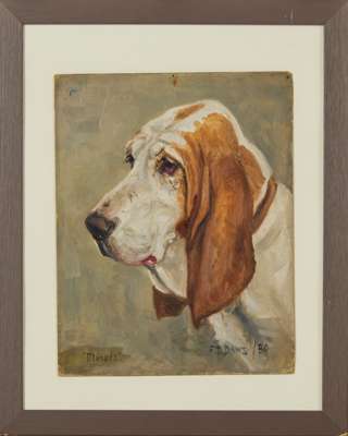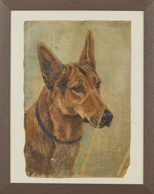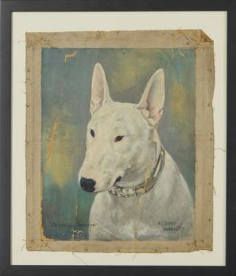 to include a Basset hound ‘Musket’, signed and dated 1930, oil on card; an English bull terrier ‘Silversea Sensation’, signed and dated June 16, 1927, oil on unstretched canvas; and a German shepherd, signed and dated 1926, oil on unstretched canvas; all frame (3)