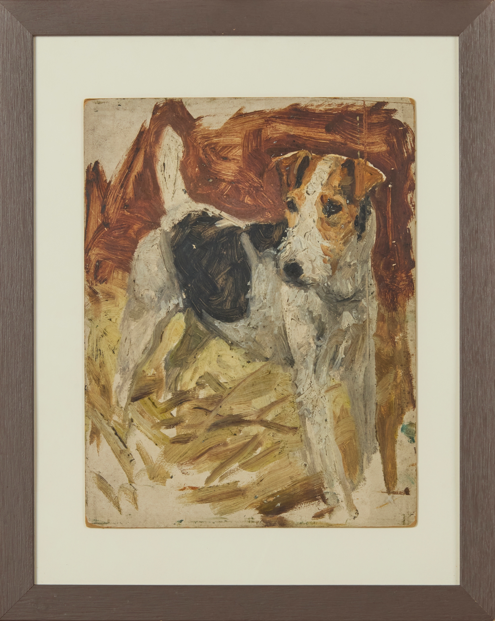 to include a double portrait of Parson Russell terriers, oil on unstretched canvas, signed; and a Jack Russell terrier, oil on board, unsigned; laid and framed (2)