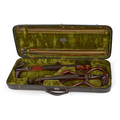 in a fitted leather case with green velvet lined interior, containing three additional bows; together with ANOTHER MUTE VIOLIN, uncased