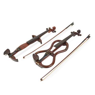 TWO CASED MUTE, OR FRAME, VIOLINS, RETAILED BY RUSHWORTH & DREAPER, LIVERPOOL