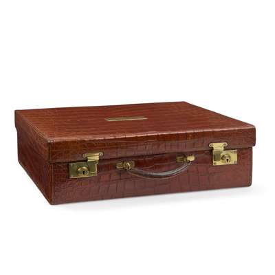 one in dark brown skin with a matching luggage tag, the interior fitted with a lift-out tray; the other in medium brown skin and a void relined interior (2)
