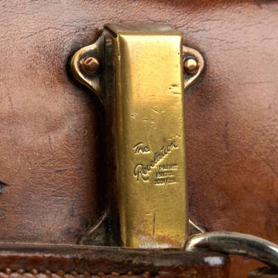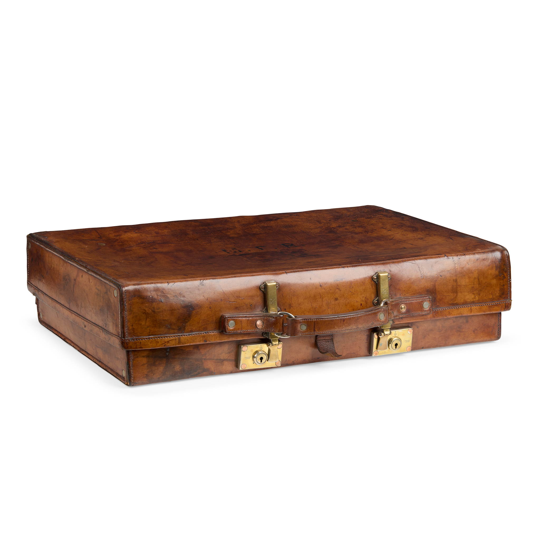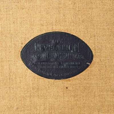 fitted with extending brass fittings to enlarge the inner capacity, lined with linen with an embossed trade label, stamped on the hardware 'The Revelation PAT NOS 181170 3061/ 23; monogrammed M.F.R. on the exterior