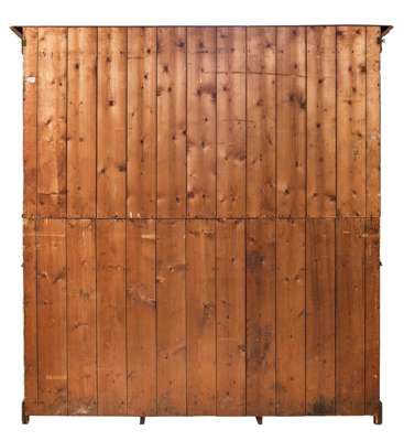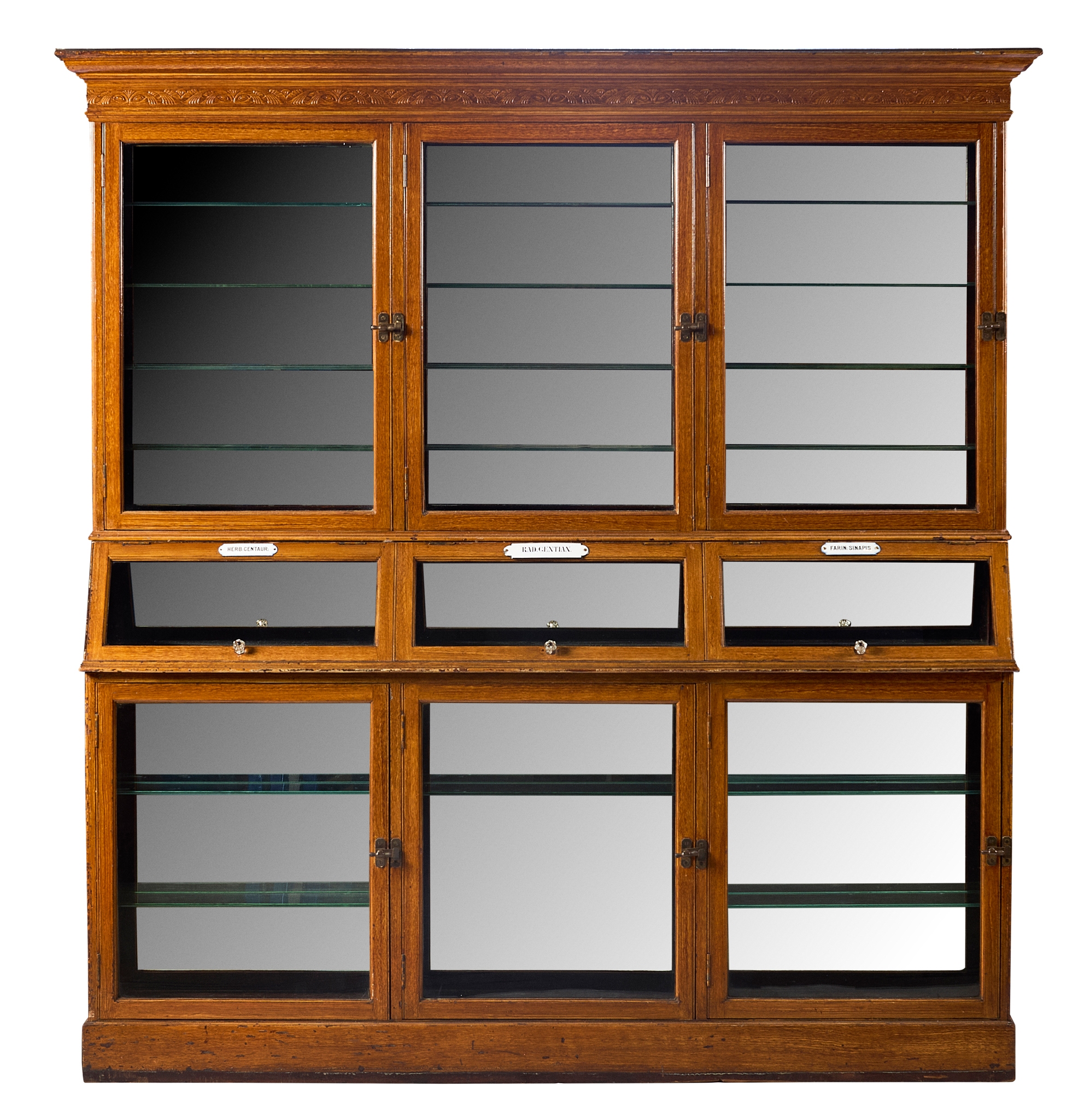 the moulded cornice above a foliate carved frieze and three glazed doors enclosing glass shelves and a mirrored back; the lower part with three sloping hinged compartment doors with enamel labels above, over three further glazed doors enclosing glass shelves and a mirror back, on a moulded plinth base