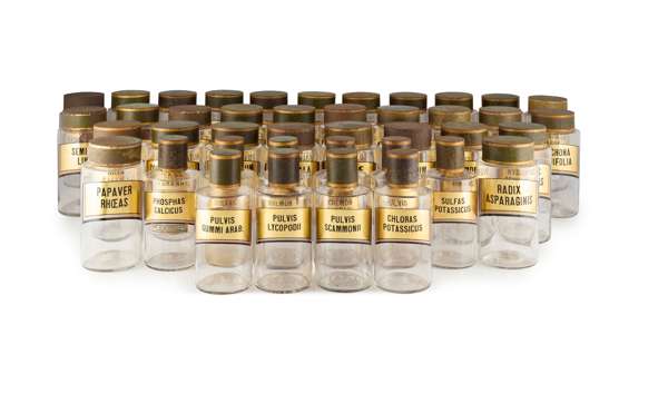 of cylindrical form, each inscribed in black on a gilt banner with a black rim, the olive green enamelled tin covers with gilt borders, various inscriptions including ‘CORTEX AURANTII AM’, ‘TILIA EUROP:BRACT’, ‘FLORES PECTORALES’, ‘ROSA GALLICA’ etc, ten are of slender form for wet drugs (41)