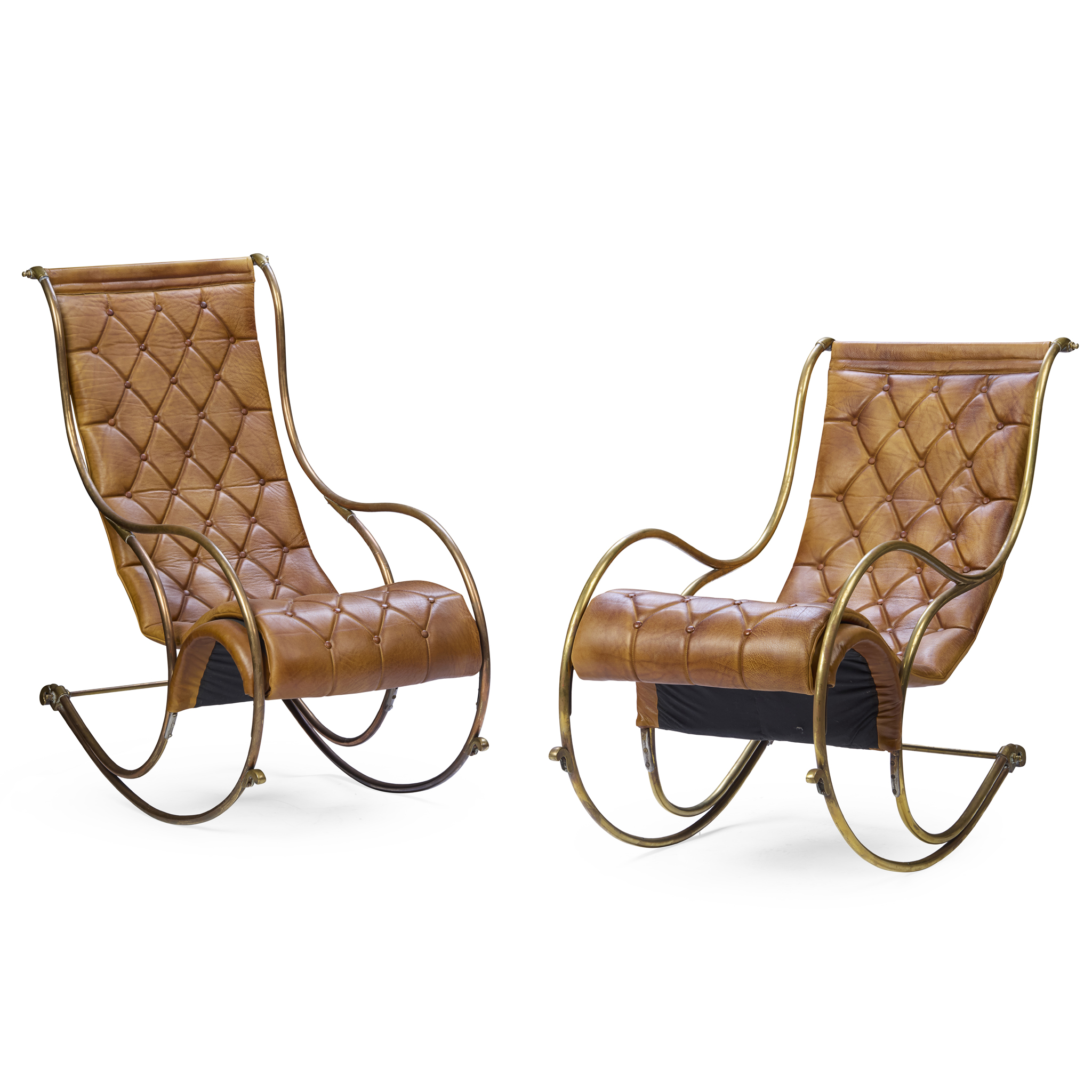 MATCHED PAIR OF BRASS AND LEATHER ROCKING CHAIRS