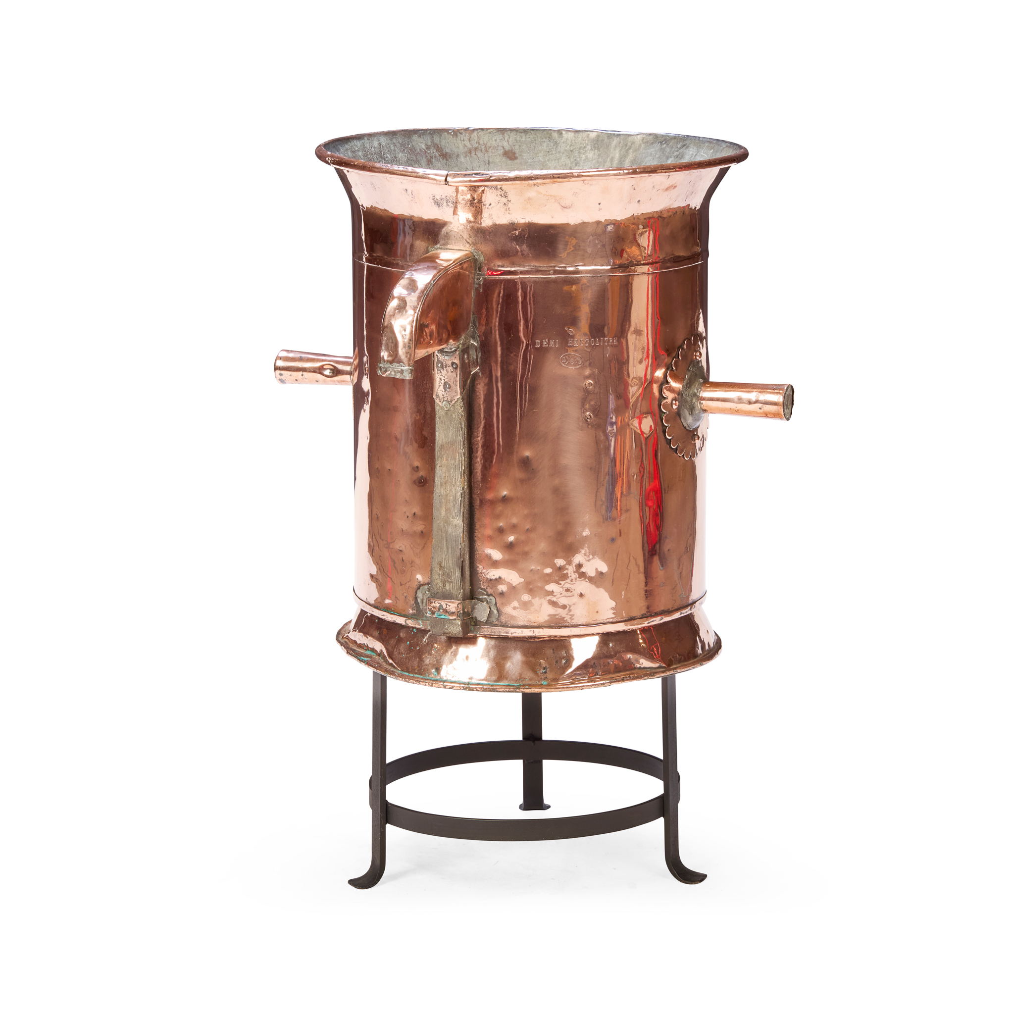 cylindrical with a spigot, stamped DEMI HECTO LITRE, on a circular wrought iron stand