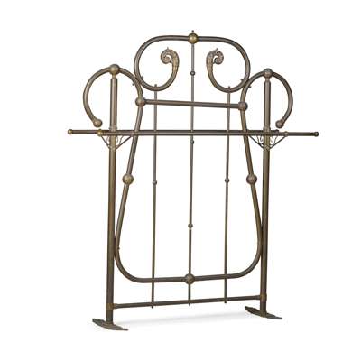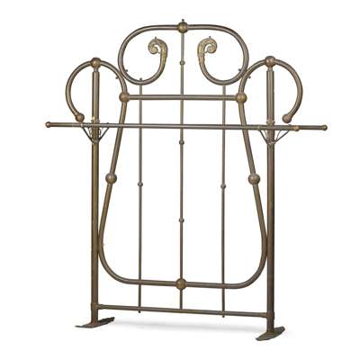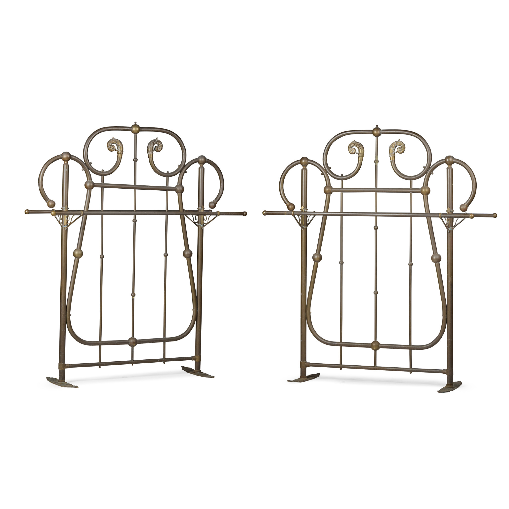 with arching scrolled cresting above hanging rails to both sides, on trestle bases cast with palmettes (2)