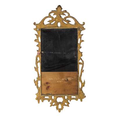 the shaped mirror plate in a pierced and carved frame with foliate scrolls, rocaille, and foliate trails