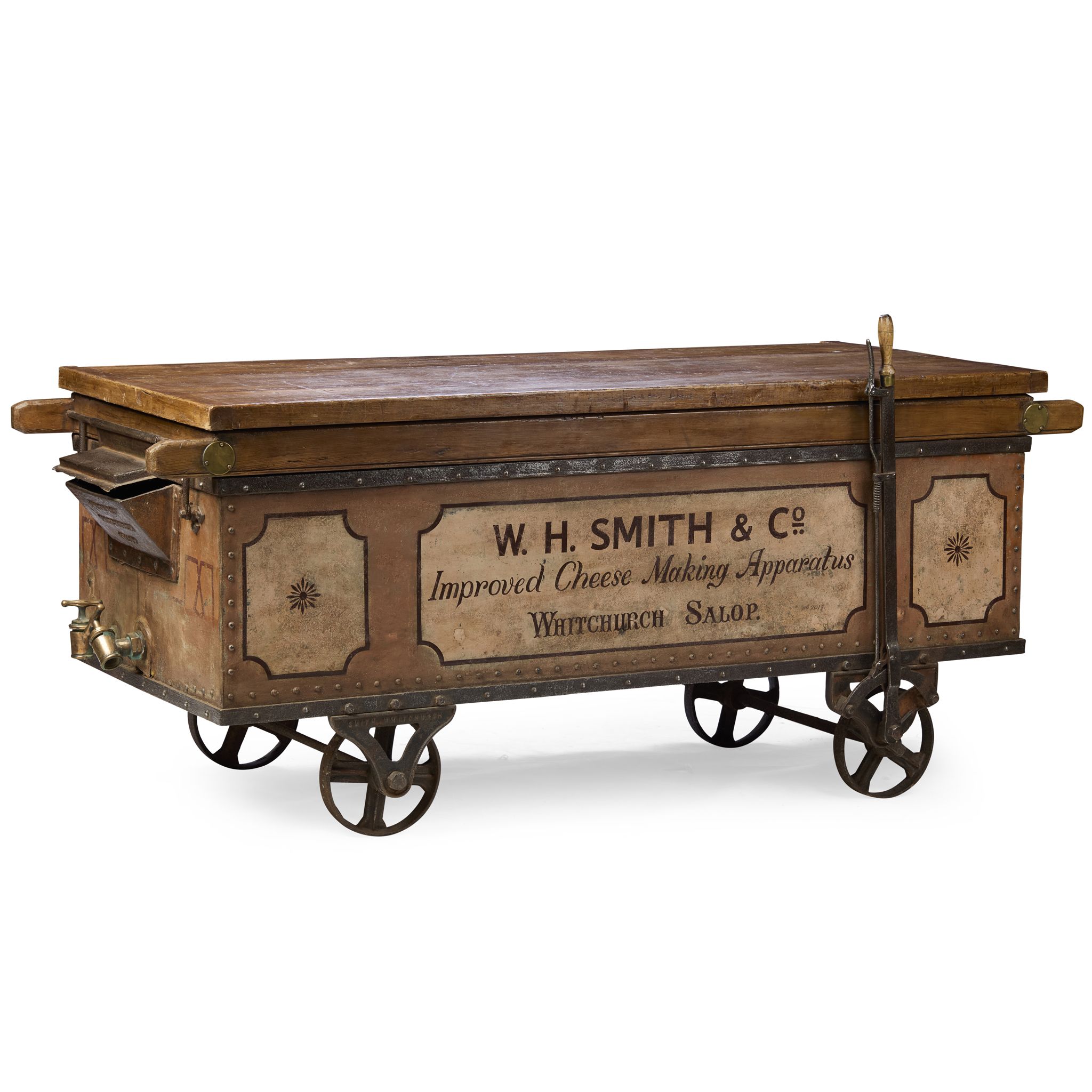 with metal fittings and mounts, original wheels and tilt lever, SMITH & CO/ WHITCHURCH/ SALOP; later painted with a removable thick oak plank top for use as a table