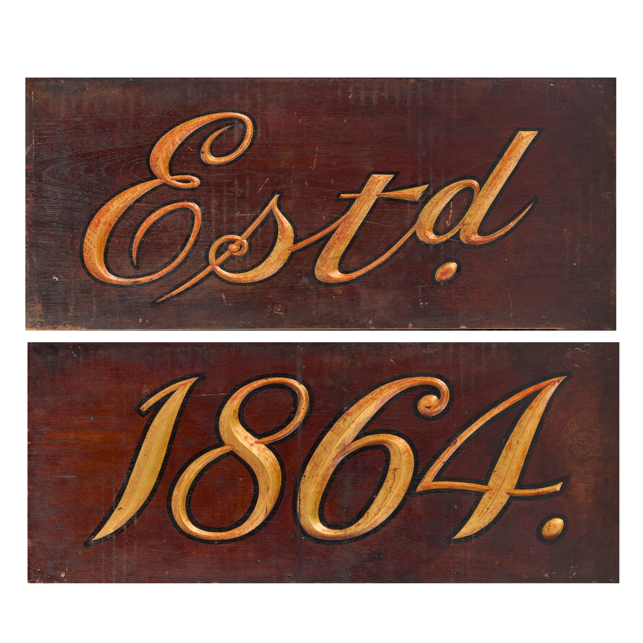 each a rectangular oak plank, the first inscribed 'Estd' and the other ‘1864.’ (2)