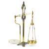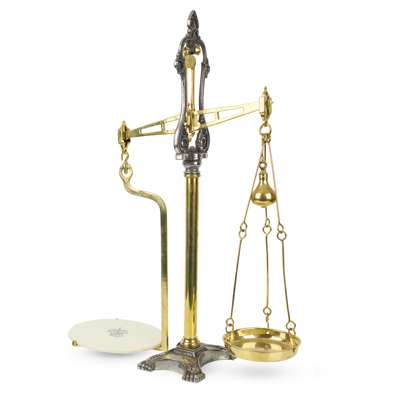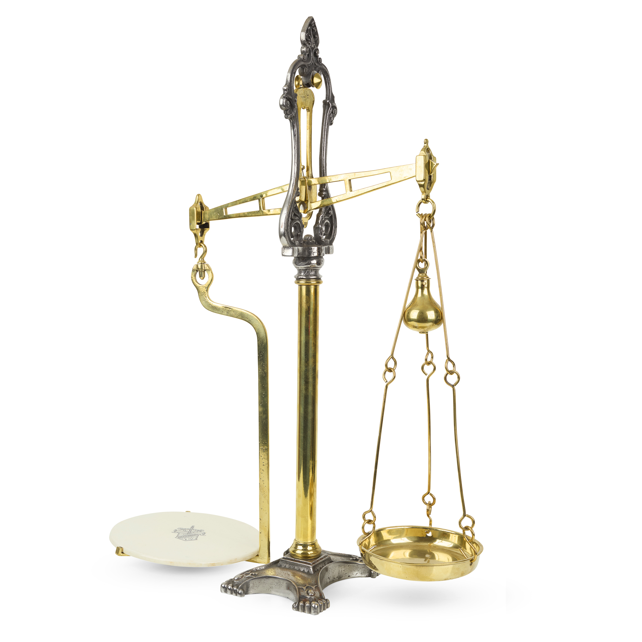 with a cast iron base and brass column with balancing arm suspending a brass pan and weight with a ceramic glazed platform opposing