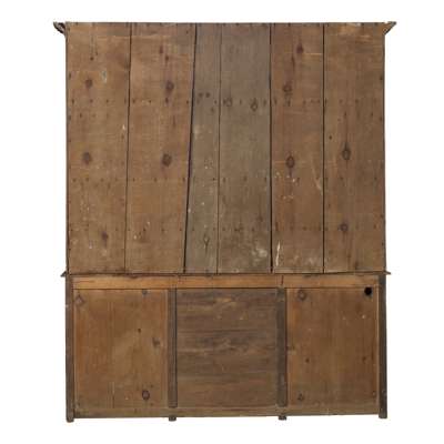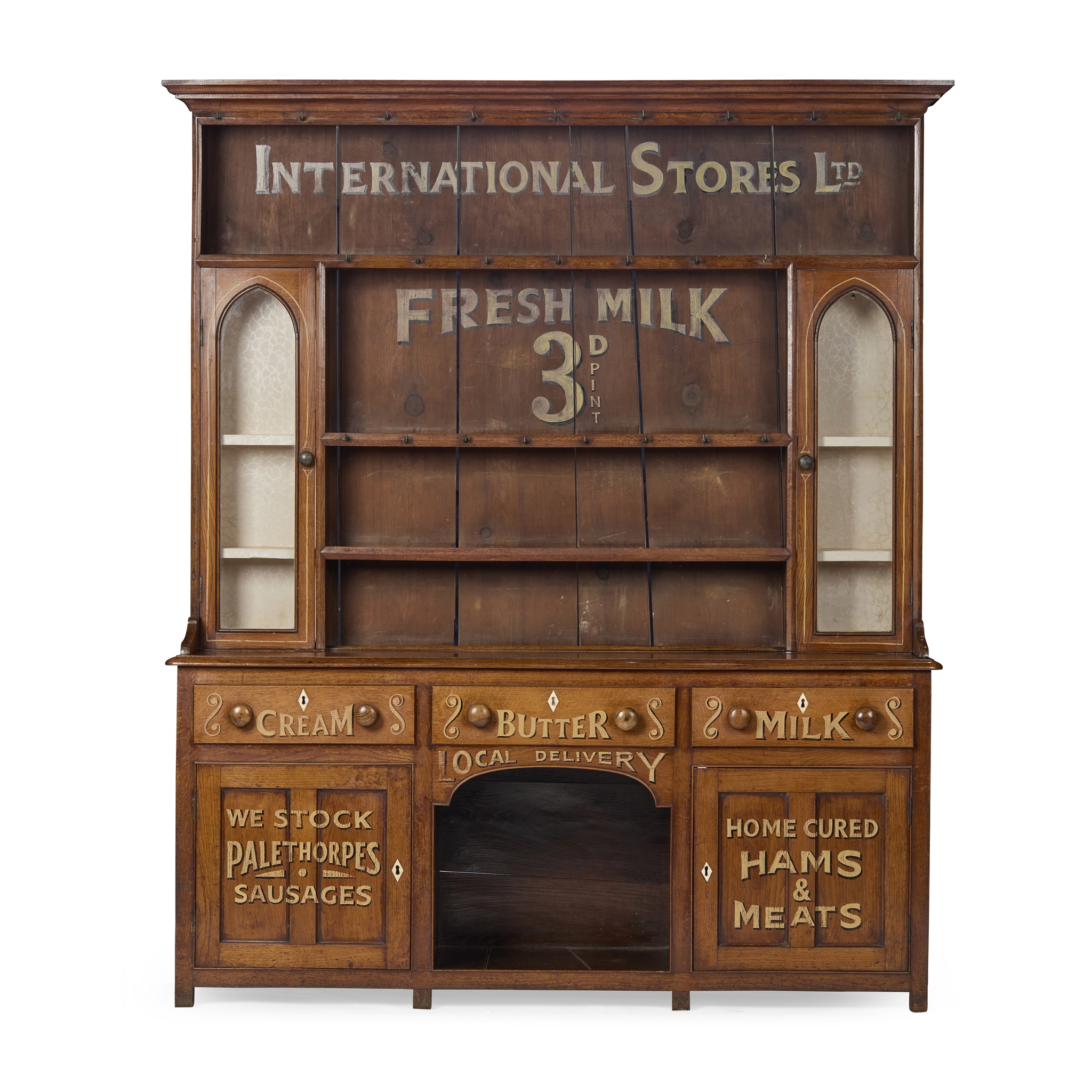 the upper part with a moulded cornice above open shelves flanked by a pair of lancet arch glazed doors; the lower part with three short drawers above a centre recess flanked by panelled cupboard doors, on stile feet; later painted with INTERNATIONAL STORES LTD with various inscriptions for milk, cream, butter, sausages, ham, etc.