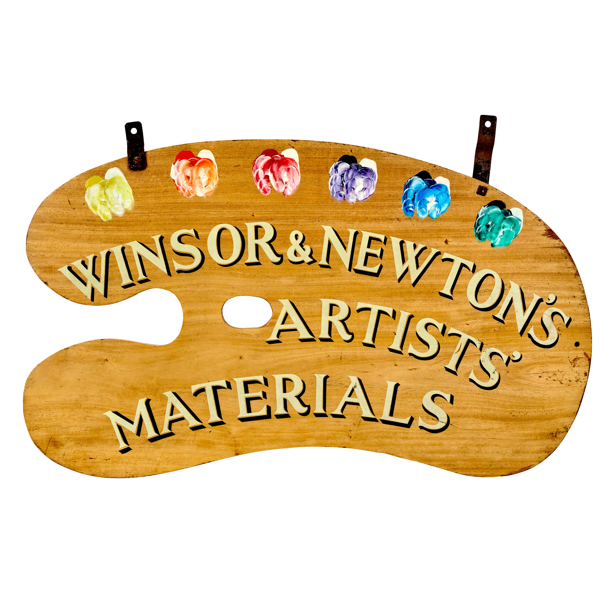 in the form of an artist's palette, inscribed on both sides WINDSOR NEWTON ARTIST'S MATERIALS, with iron hanging brackets