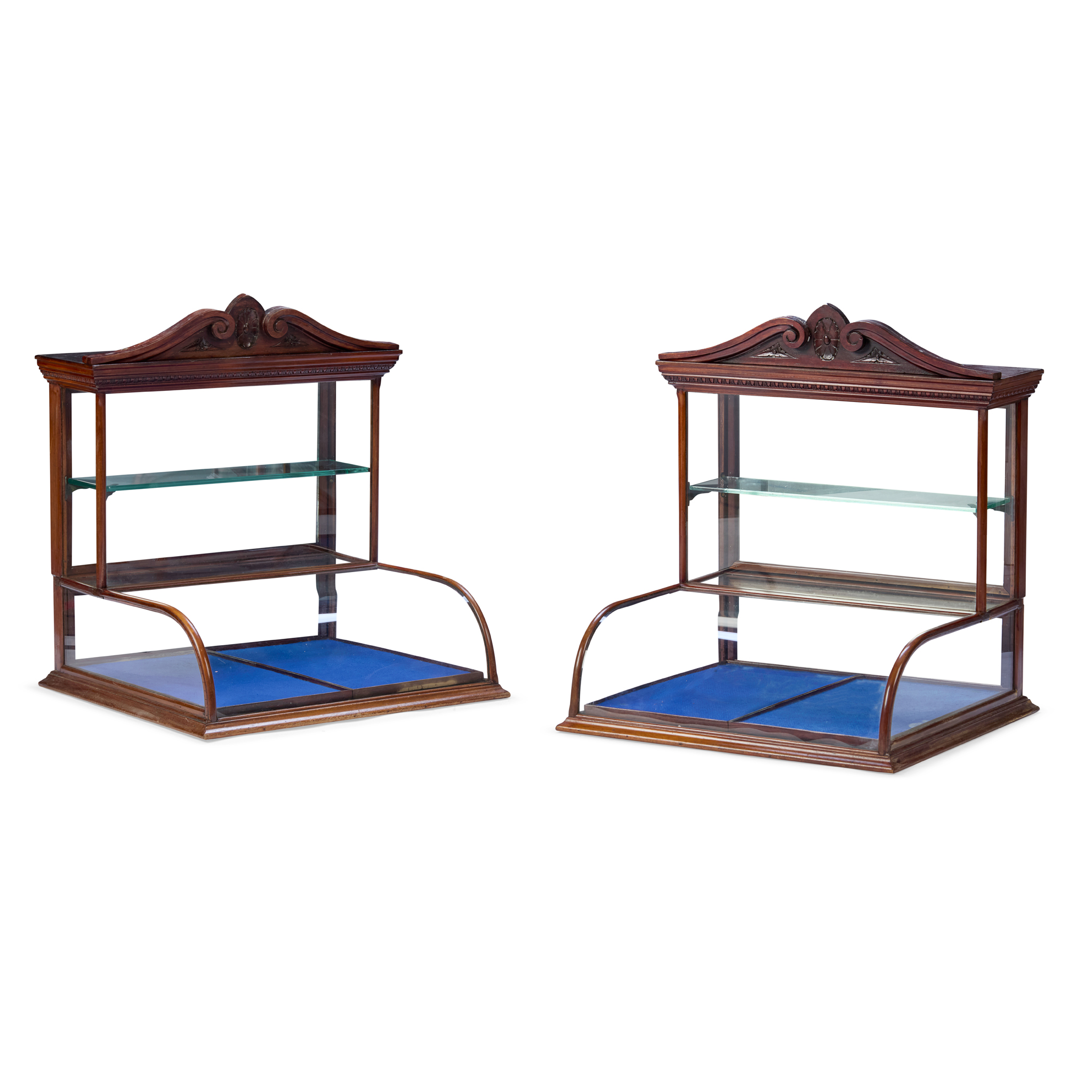 the upper cases with carved pediments above an egg and dart frieze, the interiors with a mirror back and a glass shelf; above projecting glazed base cabinets lined with blue fabric (2)