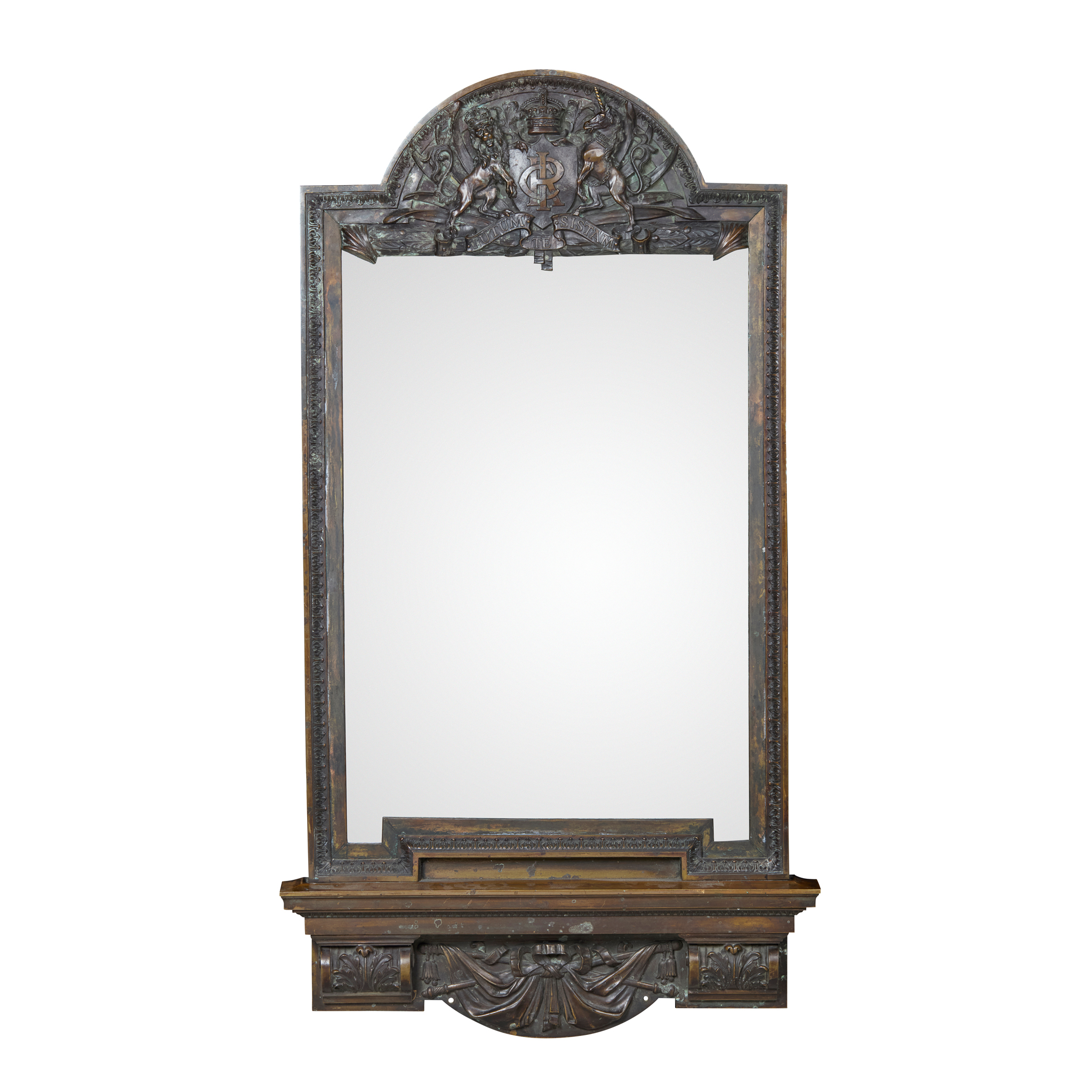 in the neo-classical style, the shaped rectangular mirror plate in a bronze frame surmounted by an arched pediment cast in relief with a coat of arms and shield with the initials R.I.C. above the motto ‘Tutum Te Sistam’