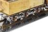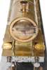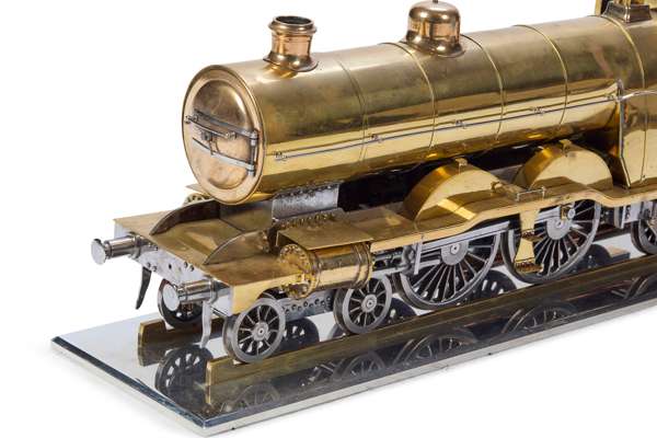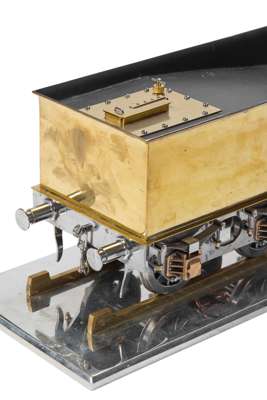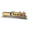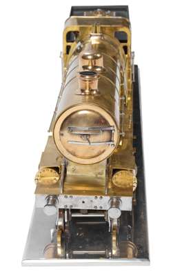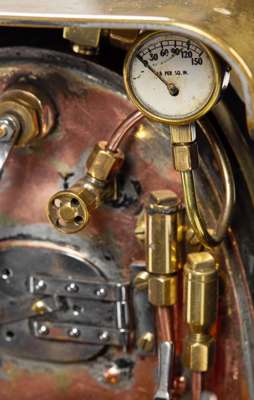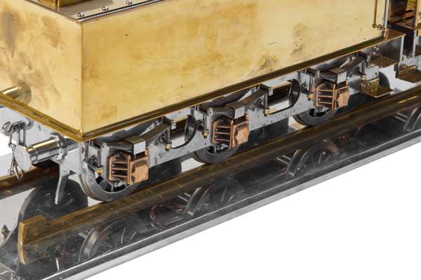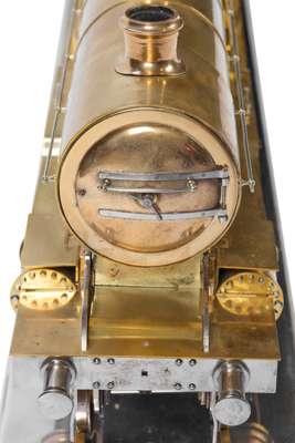 built to the design of Henry Ivatt in polished brass, copper and steel, with fittings including water level and pressure gauges, safety, blower, steam brake injector, whistle clack and blowdown valves; the chassis details include twin outside cylinders with inside Stephenson's link reverse, fluted coupling and connecting rods, cylinder draincocks, mechanical lubricator, eccentric driven feed pump and bypass, injector, whistle steam operated brake gear, steps and hand irons; on a section of platform track