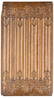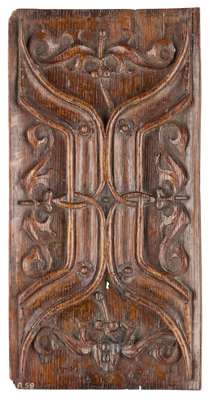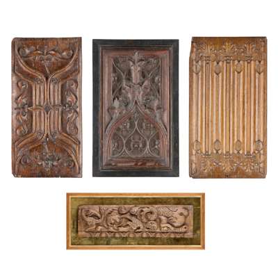 comprising a linenfold panel carved with stylised leaves and berries; 46cm high, 25.5cm wide; a panel centred with a knotwork motif with further flowerheads and scrolling leaf designs, 42cm high, 21cm wide; a panel with blind fretwork carving depicting flowerheads within a pointed arch carved with acanthus leaves and further flowerheads, within a moulded border and ebonised frame, 38cm high, 24cm wide; and a panel with Renaissance style carving depicting a scaled sea creature surmounted with a putto blowing a horn, with further scrolling leaf and exotic bird decoration, on a velvet mount within a modern frame (4)