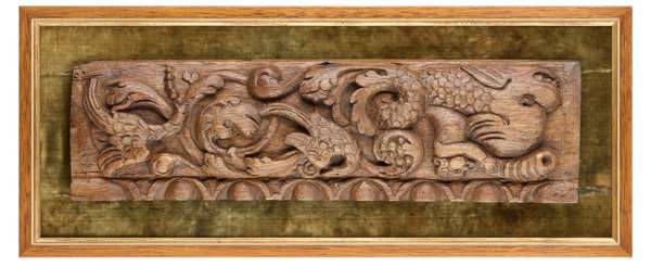 framed panel with Renaissance style carving 38cm long, 10.5cm wide, 46.2cm long, 19.3cm wide including the frame
