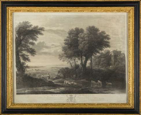one entitled ‘Mercury and Battus’, published by John Boydell, 17th January 1767; the other entitled ‘A View of Naples’, published by F. Vivares July 1769; both within period giltwood and gesso ebonised frames (2)