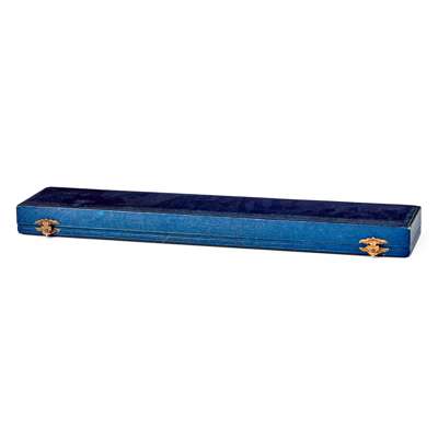 the unmarked handled in the form of an eagle's head, mounted to a long rounded double-edged blade; in a fitted leather case with cream silk lining with gilt maker's label