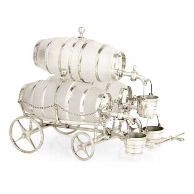 in the form of a wagon holding three frosted glass whisky barrels with taps and hanging pails