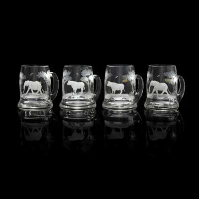 FOUR CRYSTAL NAIROBI TANKARDS ENGRAVED BY ROWLAND WARD