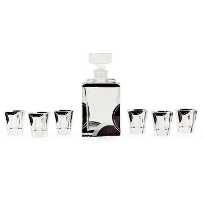 comprising a decanter and six glasses, the decanter of square form with a matching flattened square stopper, the shot glasses of tapered square form, all with black enamel and etched glass circular motifs, unmarked (7)