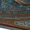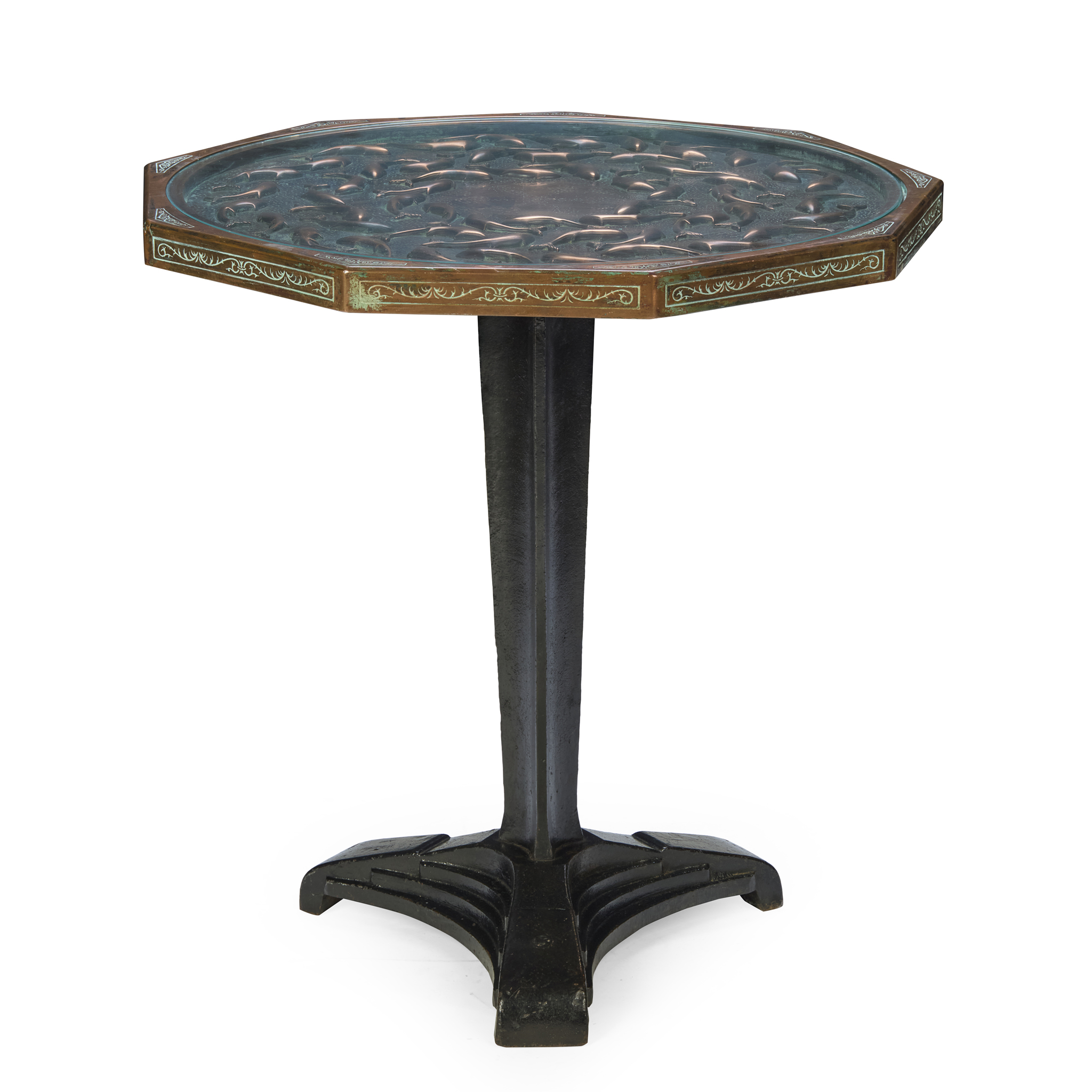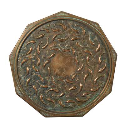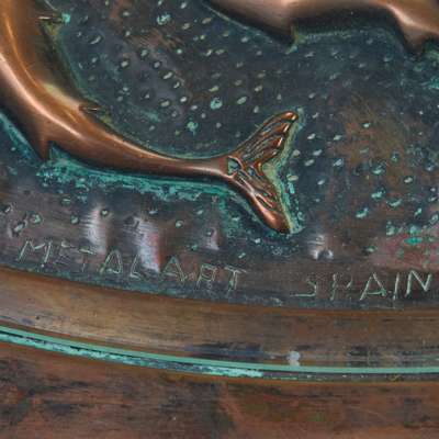 the nine sided copper top with an recessed centre embossed in high relief with swimming fish, under a glass insert, raised on a triform pedestal and Art Deco stepped base; inscribed METAL ART SPAIN