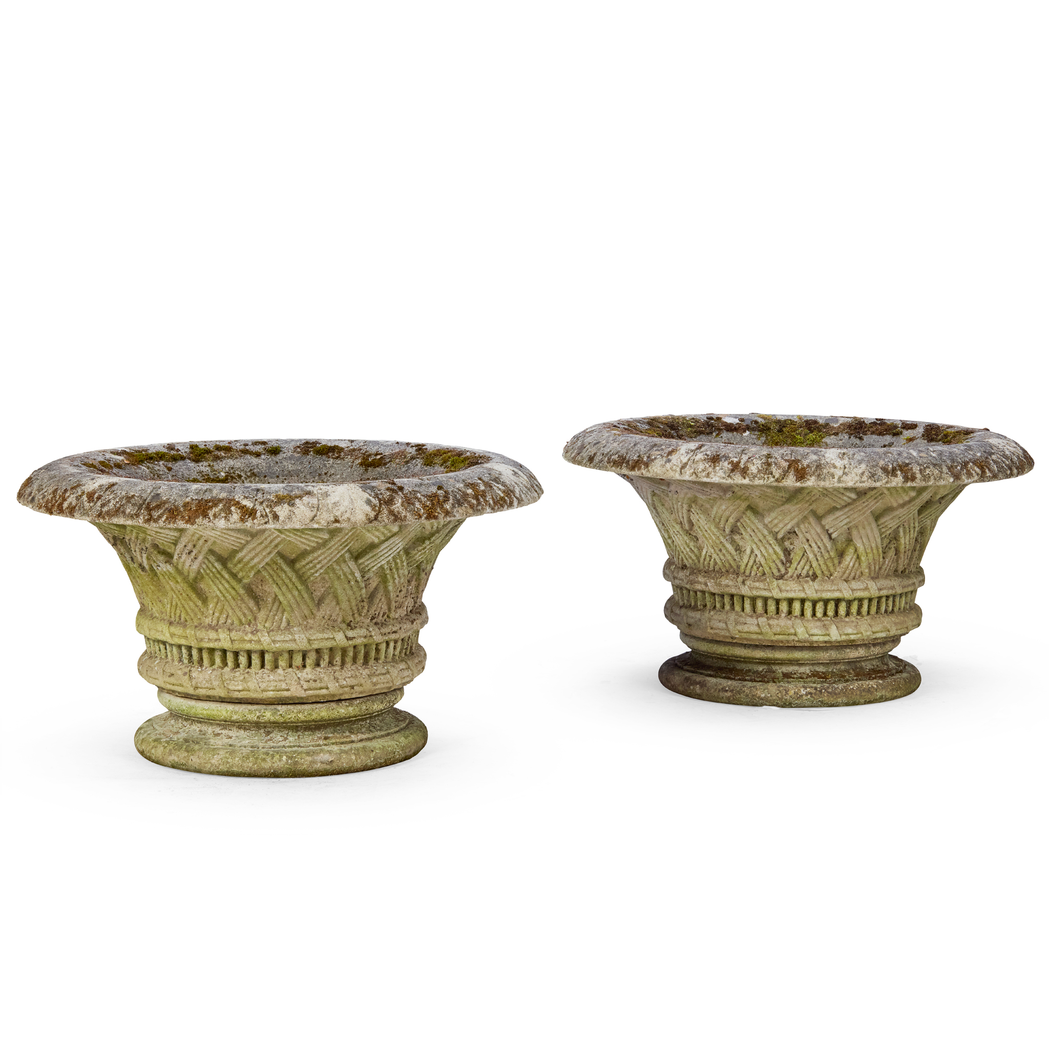 of low flared form with basket-weave exteriors, raised on circular bases (2)