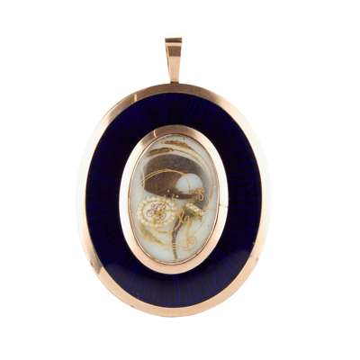 watercolour on ivory, the sitter with natural brown hair wearing a white shirt and stock and black coat, against a light background, the reverse with a lock of hair on an opalescent ground, set as a wheat sheaf with gold thread and monogrammed initials in a seed pearl surround, within a blue guilloche enamel border, set in an unmarked yellow metal frame with suspension loop