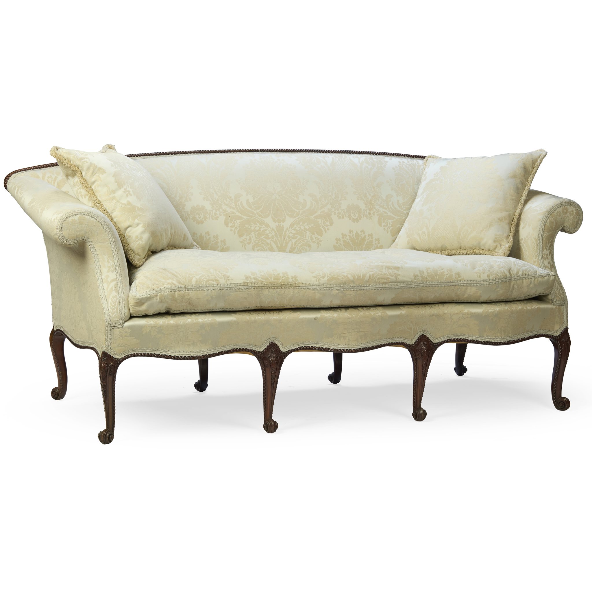 the arched back above a long loose cushion seat flanked by high scrolled arms, raised on eight cabriole legs carved at the knees with scrolled cartouches and pendent harebells, ending in scrolled toes; in eau de nil damask upholstery