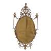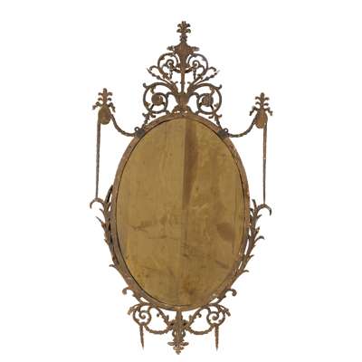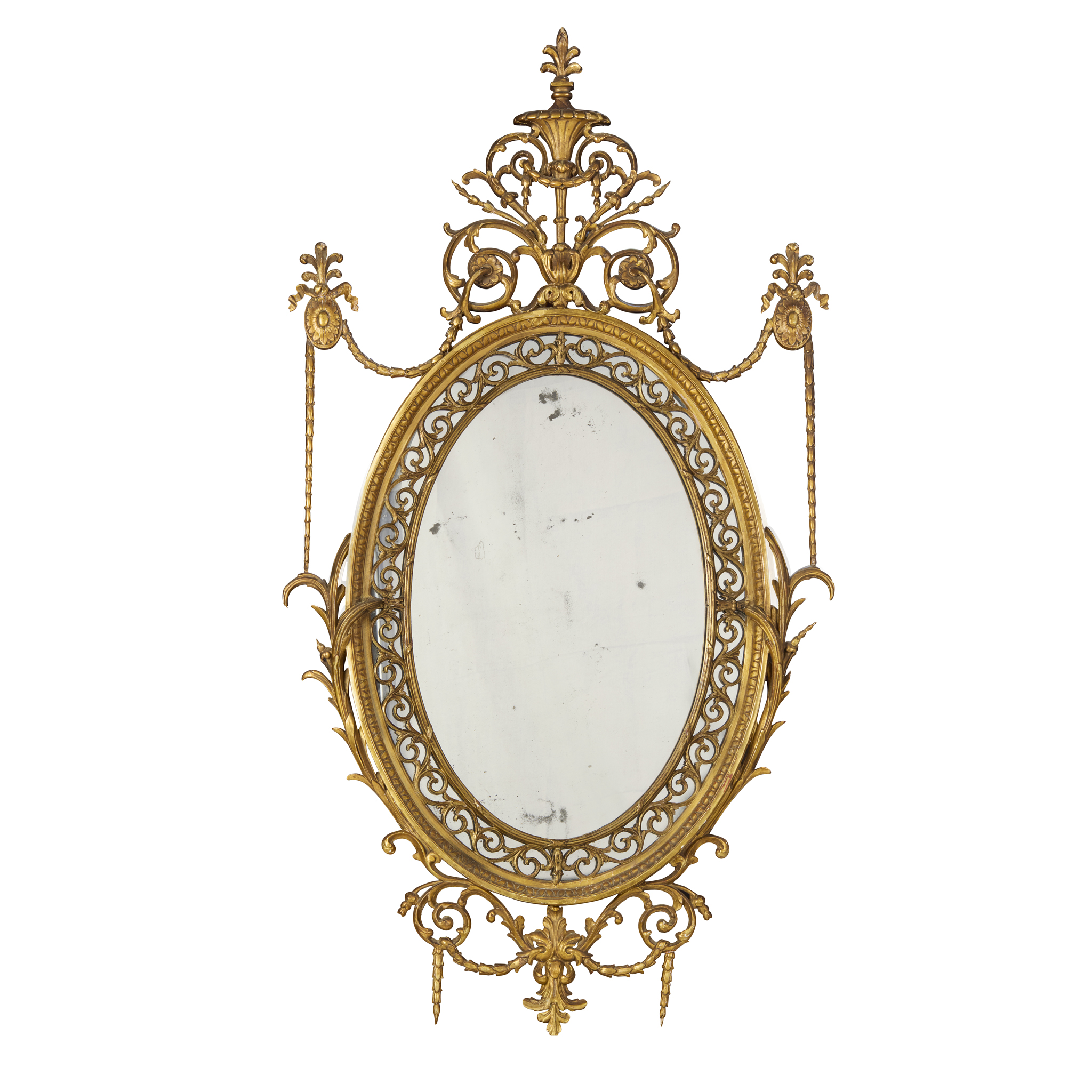 the oval mirror plate with a pierced foliate scroll border and stiff leaf moulded frame, surmounted by a foliate scroll cresting with a central torch issuing a palmette finial, the sides with trailing husks