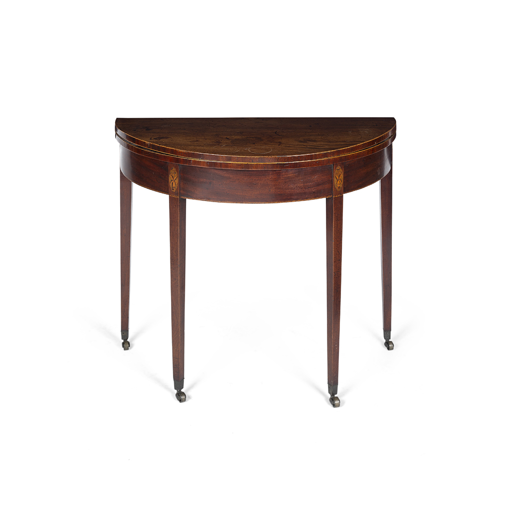 LATE GEORGE III MAHOGANY INLAID DEMILUNE CARD TABLE