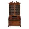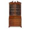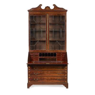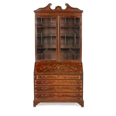 the swan neck pediment above a pair of astragal glazed doors opening to shelves; the lower part with a slant front opening to an interior fitted for writing with pigeon holes and drawers, over four long graduated drawers, raised on bracket feet; inlaid throughout with foliate scrolls, harebell trails, laurel, flowerheads and anthemion