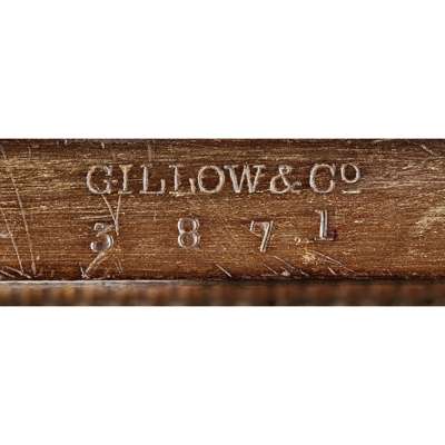 the rectangular top with brass beading above a single long drawer, above a central tier and base with a drawer, raised and divided by fluted supports, on turned legs, stamped GILLOWS & CO. and no. 3871