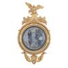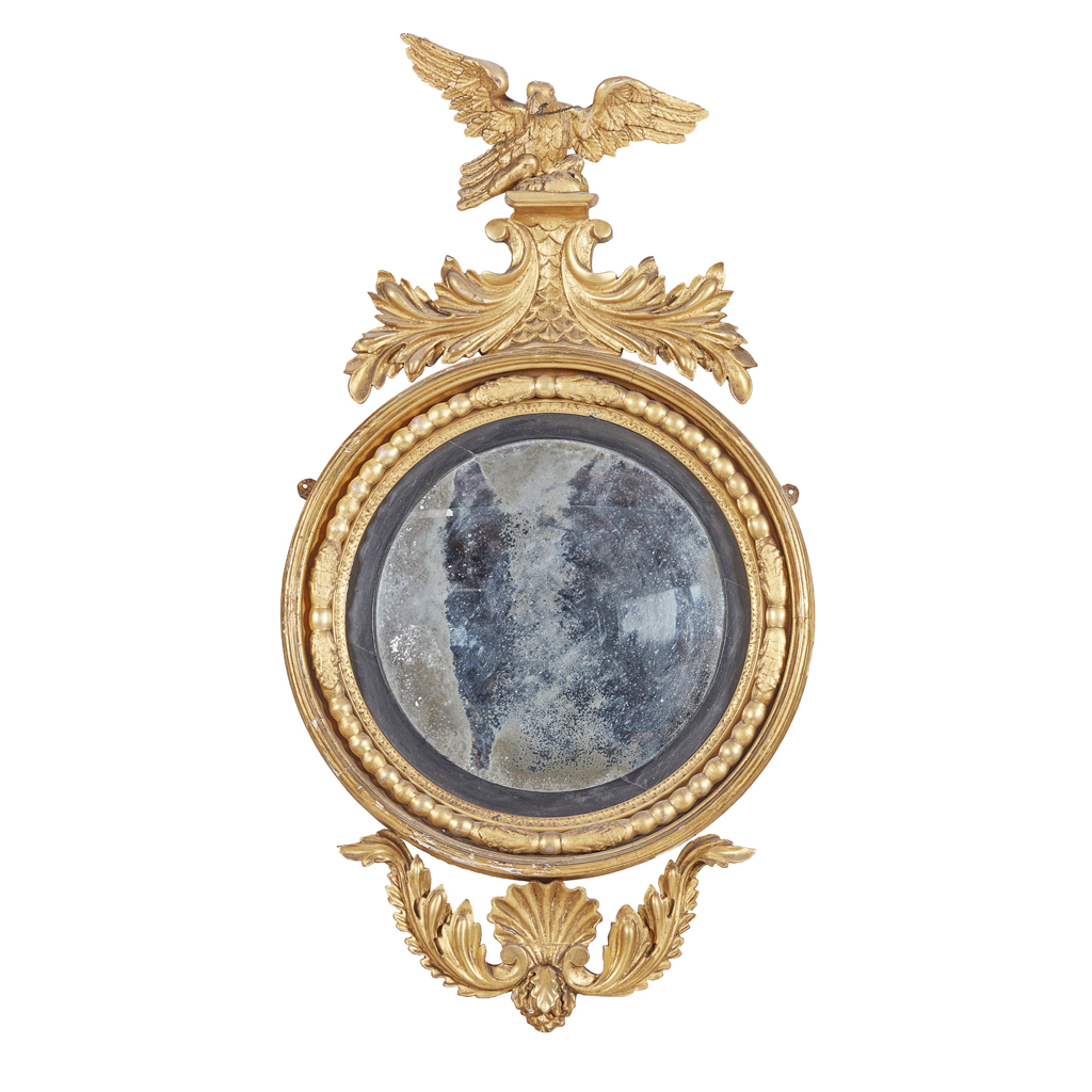 the circular mirror plate in a black slip and bead moulded frame marked with acanthus, with an eagle and acanthus cresting and shell pendant finial