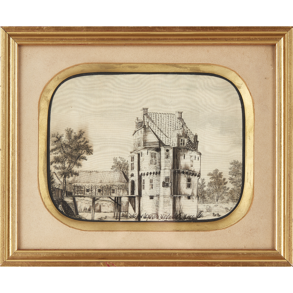 worked with black hair on an ivory silk ground depicting a moated tower house, in a modern giltwood frame, signed on reverse 'Worked by Charlotte Lady Oakeley' and initialled 'A.M.'
