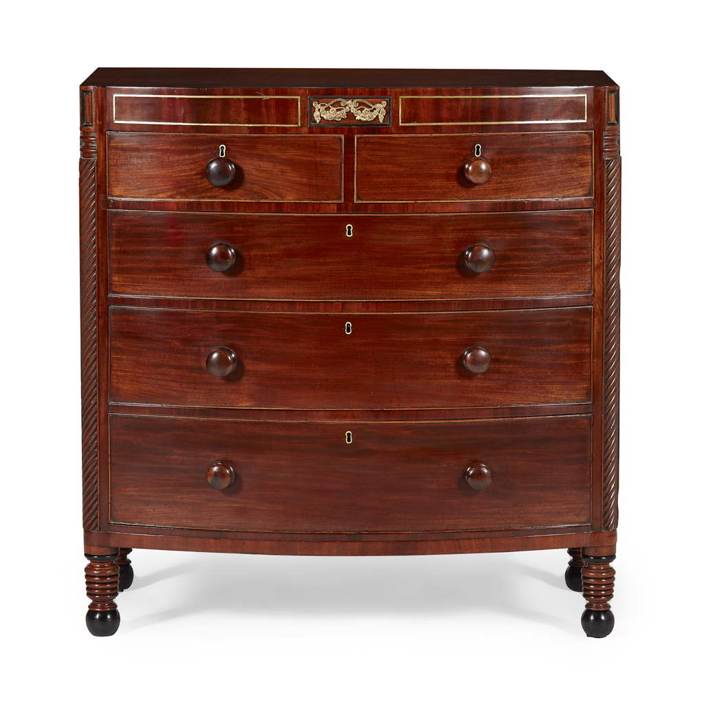 IRISH REGENCY MAHOGANY BRASS INLAID BOWFRONT CHEST OF DRAWERS