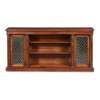 the central section with fixed open shelves flanked by doors with brass grille inserts enclosing adjustable shelves, flanked and divided by columns with lotus carved capitals, on a plinth base