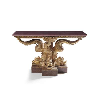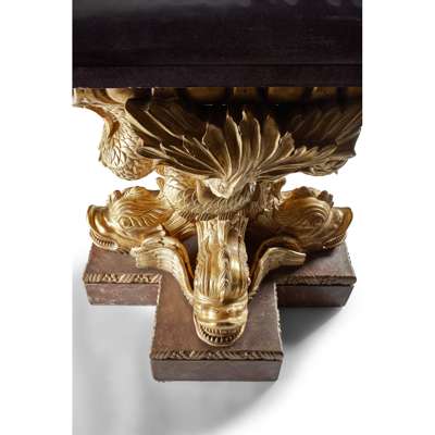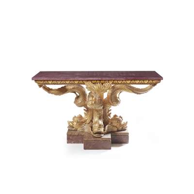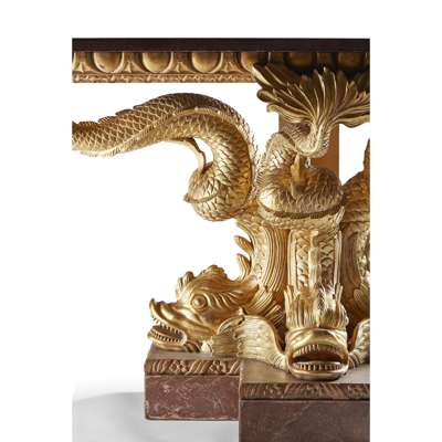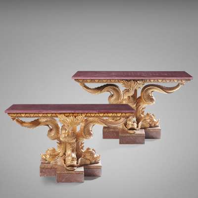 Note: This pair of giltwood tables, with their distinctive entwined dolphin supports, are based on a suite of at least twelve tables designed by Charles Heathcote Tatham for Marsh & Tatham, and commissioned for George Granville Leveson-Gower, Marquess of Stafford and 1st Duke of Sutherland. Intended for the 'New Gallery' at Cleveland House in London, later called Bridgwater House, the suite of tables were designed to display marble slabs purchased in Italy in the 1750s by the Duke of Bridgwater. Furnishing the vast art gallery which housed paintings from the famed Orleans collection, the tables varied in size to accommodate the different marble slabs. The largest pair with pink granite tops remain in the collection of the Duke of Sutherland, while other examples can now be found in museums and collections around the world including the Fitzwilliam Museum in Cambridge and the Museum of Fine Arts in Boston.
