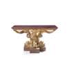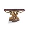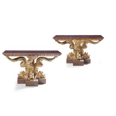 PAIR OF 'BRIDGWATER HOUSE' STYLE GILTWOOD, SCAGLIOLA PORPHYRY, AND PAINTED DOLPHIN CONSOLE TABLES