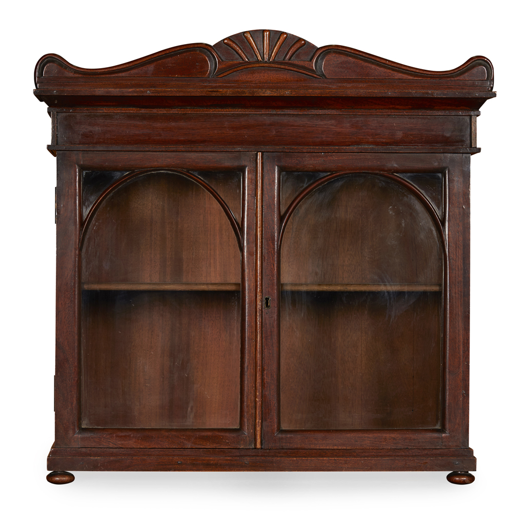 the scroll carved cornice above a pair of glazed doors with arched mullions, opening to a shelved interior, on flattened bun feet